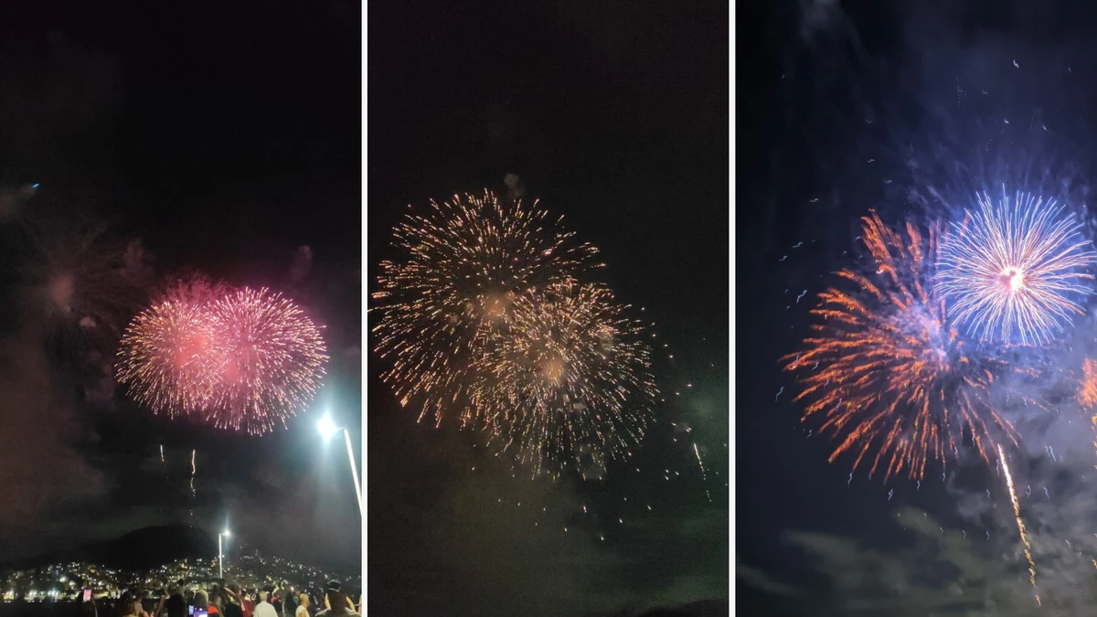 A contagem regressiva reuniu moradores e visitantes que acompanhavam a programação no local. Durante cerca de sete minutos, os fogos de baixo ruído iluminaram o céu da cidade, seguindo o padrão adotado pelo município para reduzir impactos sonoros.>