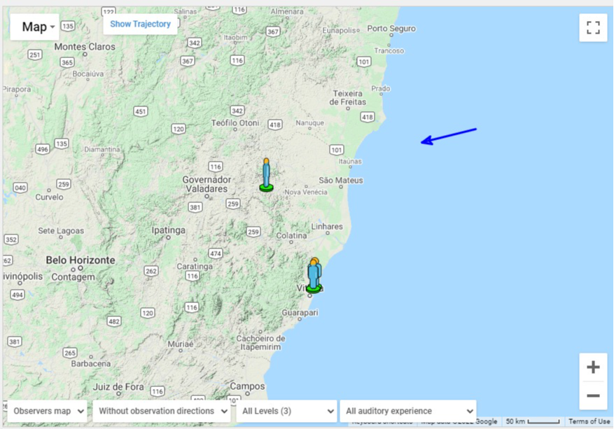 No mapa abaixo é possível observar a localização dos observadores e uma seta de cor azul. Ela mostra a rota do meteoro. >