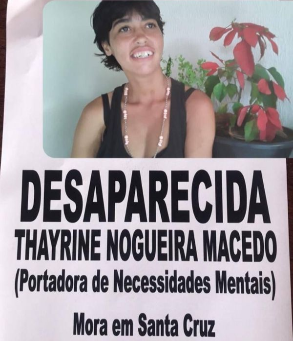 De acordo com familiares, Thayrine Nogueira, 29 anos, é portadora de transtornos mentais e foi vista pela última vez nas proximidades do bairro Santa Cruz, onde reside. O corpo do sexo feminino foi encontrado na mesma região. >