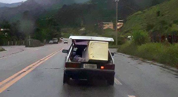 Uma cena inusitada e bastante perigosa foi flagrada pela internauta do Gazeta Online Celia Dias, enquanto trafegava, na tarde desta segunda-feira (5), na BR 262, próximo à cidade de Ibatiba. À sua frente, um carro transportava uma geladeira no porta-malas. Foi possível ver o eletrodoméstico sendo carregado de forma indevida, causando total insegurança para os ocupantes do carro e dos demais veículos que passaram pela rodovia naquele momento.>