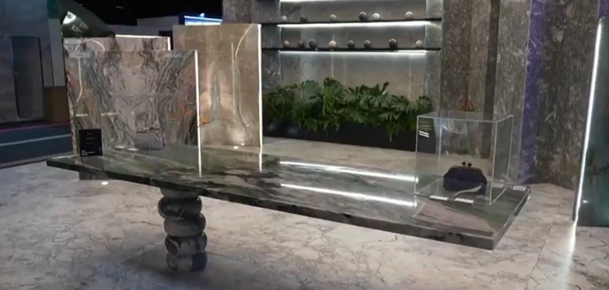 Entre as inovações capixabas, um dos destaques foi uma mesa de rocha natural, de uma tonelada, que parecia flutuar no ar. Produzida por uma empresa de Cachoeiro de Itapemirim, no Sul do Estado, a obra é feita de fuchsita. "É um dos materiais mais nobres de nossa empresa. Sua criação envolveu múltiplos profissionais de marmoraria e engenheiros para bolar a estrutura", disse o gerente comercial Raphael Silveira.>