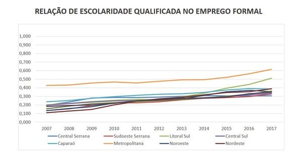 As regiões Litoral Sul e Metropolitana são as que apresentaram as menores participações de jovens até 24 anos no estoque do emprego formal. Ambas tinham índice superior a 0,6 em 2007 e, dez anos depois, atingiram 0,16 e 0,17 respectivamente. De acordo com análise feita pelos pesquisadores, esse dado também é influenciado pelo deslocamento de jovens do interior do Estado para a Região Metropolitana em busca de um emprego com carteira assinada, mas que não encontram oportunidade.