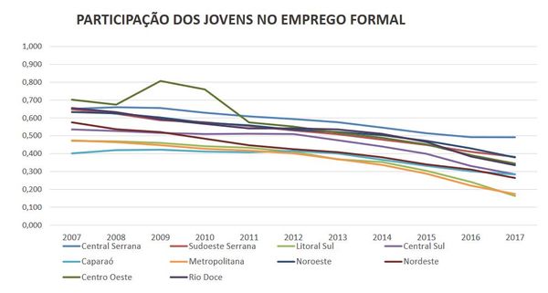 Contribuem para esse cenário, segundo o documento, além da queda na remuneração, a redução do ingresso de jovens e uma maior dificuldade na obtenção do primeiro emprego. Os dados vêm de um estudo elaborado por pesquisadores da Universidade Federal do Espírito Santo (Ufes) e do Instituto Federal do Espírito Santo (Ifes) que considerou o intervalo entre 2007 e 2017.>