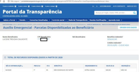 Os dados do auxílio emergencial constam no Portal da Transparência do governo federal, mantido pela Controladoria-Geral da União (CGU). O sistema disponibiliza a lista de beneficiários e as parcelas pagas. >