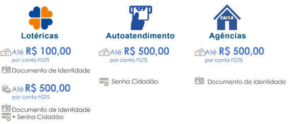 Com o cartão cidadão e a senha cidadão, os trabalhadores podem optar pelo saque nos terminais de autoatendimento, casas lotéricas, correspondentes Caixa Aqui ou agências. >