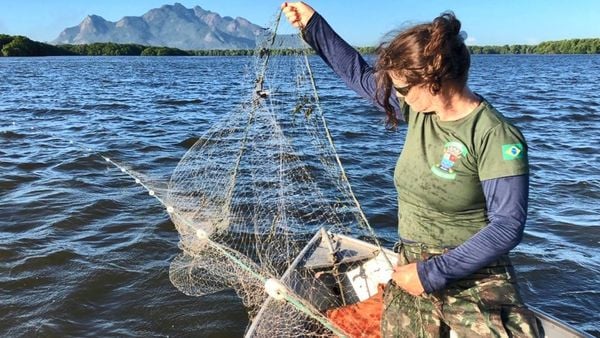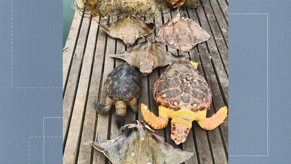 Um grupo de praticantes de canoa havaiana encontraram animais mortos em uma rede de pesca. A rede estava armada entre as ilhas do Boi e do Frade. Tartarugas, peixes e até uma arraia ficaram presos na malha.>