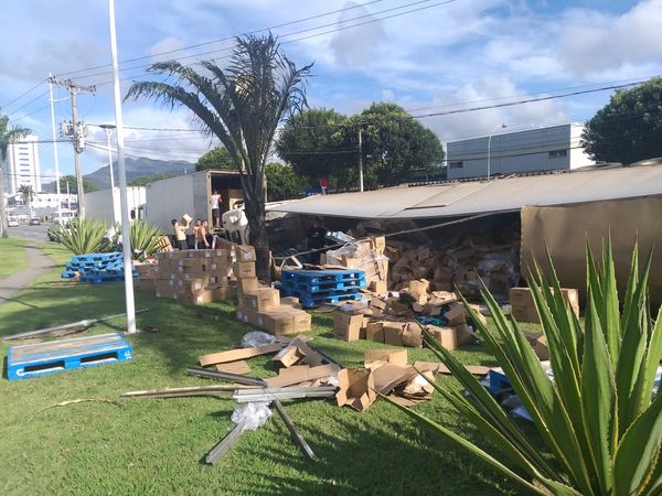Uma carreta tombou em frente ao Serviço Social da Indústria (Sesi) de Laranjeiras, na Serra. O acidente aconteceu na avenida Eudes Scherrer de Souza, na madrugada deste sábado (12). >