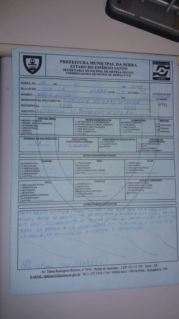 O imóvel no bairro Maria Niobe, região de Serra Sede, foi vistoriado pela Defesa Civil no dia 16 de maio de 2019. Segundo a prefeitura, a equipe foi acionada pela filha de Osvaldina. A moradia foi interditada "por riscos de deslizamento de terra e pelas patologias apresentadas na moradia (parede fissurada, vigas e colunas com ferragens expostas)".>