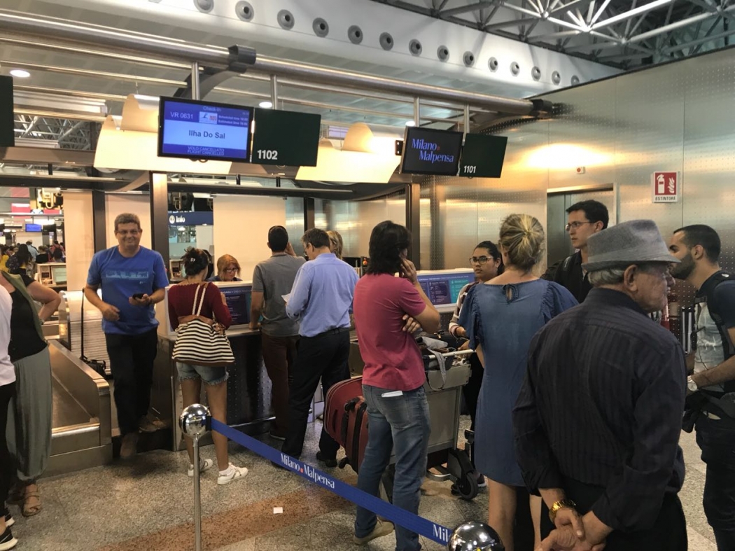 Raquel relata que, ao chegar no guichê da Cabo Verde Airlines, no Aeroporto de Milão, no momento de realizar o check-in para embarque, funcionários da empresa pegaram os nomes dos passageiros para os embarcar em um ônibus e levar para um hotel.>