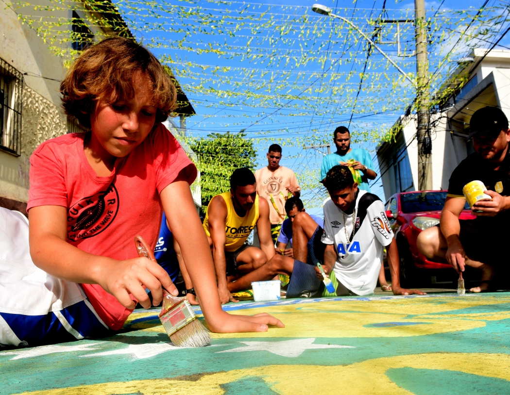 Segundo o professor de educação física, Guilherme Torres, os enfeites começaram a ser colocados em maio. É um momento de interação e de reunir a comunidade. No dia dos jogos do Brasil, colocaremos a televisão na rua e iremos fazer um churrasco, relata.>