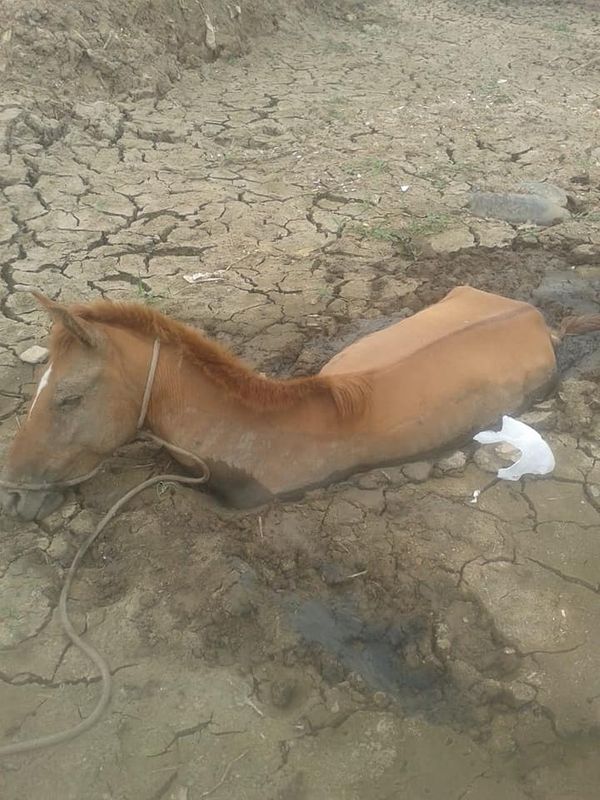 Alguns moradores lavaram o animal e deram água para ele. Em seguida, a égua seria levada para uma área de capim para se alimentar.>