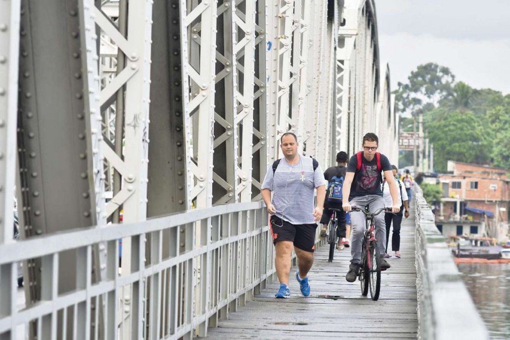 Na região da ponte Florentino Avidos as pessoas até conseguem fugir do congestionamento quando decidem fazer o trajeto inteiro, ou parte dele, até o trabalho a pé. No entanto, outro problema aparece: a calçada estreita se torna um espaço disputado entre os pedestres e os ciclistas.>