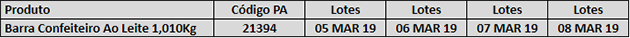 Em nota, a empresa ZD Alimentos S.A., responsável pelo produto, afirmou que foi detectada uma falha operacional pontual em uma linha de produção que pode ter ocasionado a liberação de pequenos filamentos metálicos no produto Barra Confeiteiro ao Leite 1,010Kg, da marca Cobertop, que estão em desacordo com a Legislação de Alimentos vigente no Brasil.>