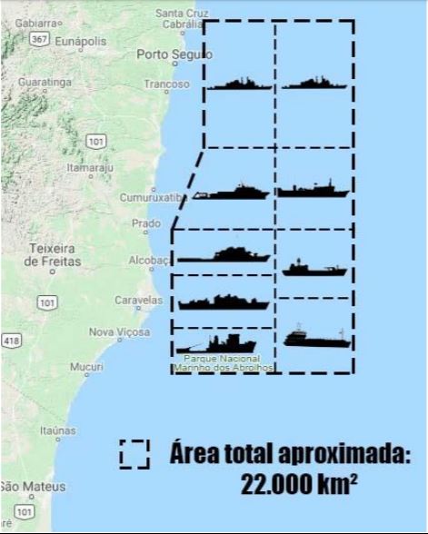 Em função disso, foi informado que o monitoramento foi ampliado na região com a frota de navios da Marinha e da Petrobras. Também estão sendo mobilizados barcos pesqueiros, bem como todas as embarcações em trânsito na região, que serão orientadas pelo canal de rádio dos navios da Marinha nas proximidades do Arquipélago de Abrolhos, em português e inglês. >