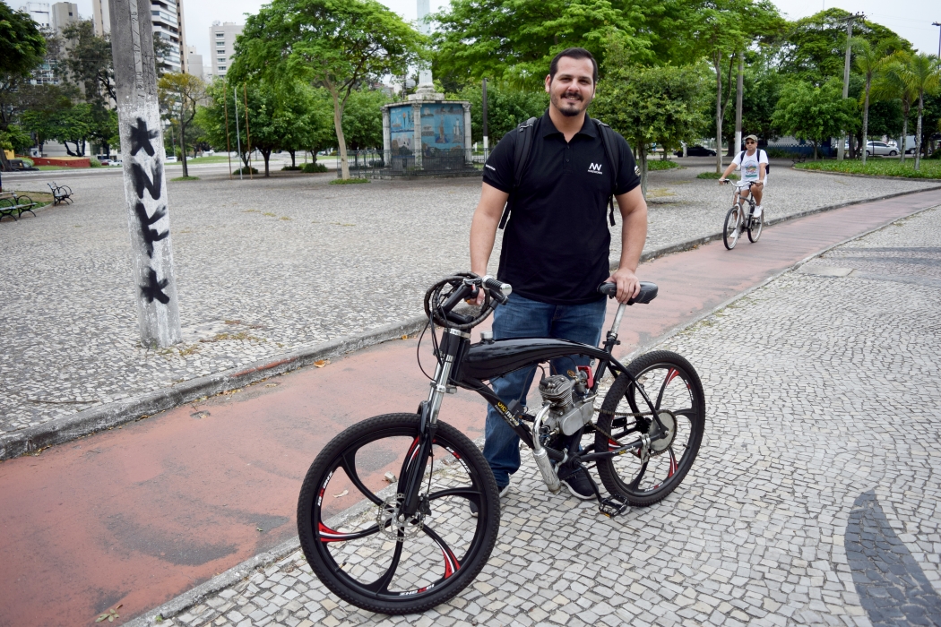 O analista de sistemas Rafael Nascimento, de 36 anos, tenta fugir do trânsito de Vitória há bastante tempo. Ele mora em Goiabeiras, trabalha na Enseada do Suá e diariamente pegaria trânsito de carro nesse trajeto. "Eu tinha um patinete elétrico, mas eu resolvi comprar a bicicleta movida a gasolina por causa da autonomia da bateria dele. Estou usando a bicicleta há dois meses", conta.>