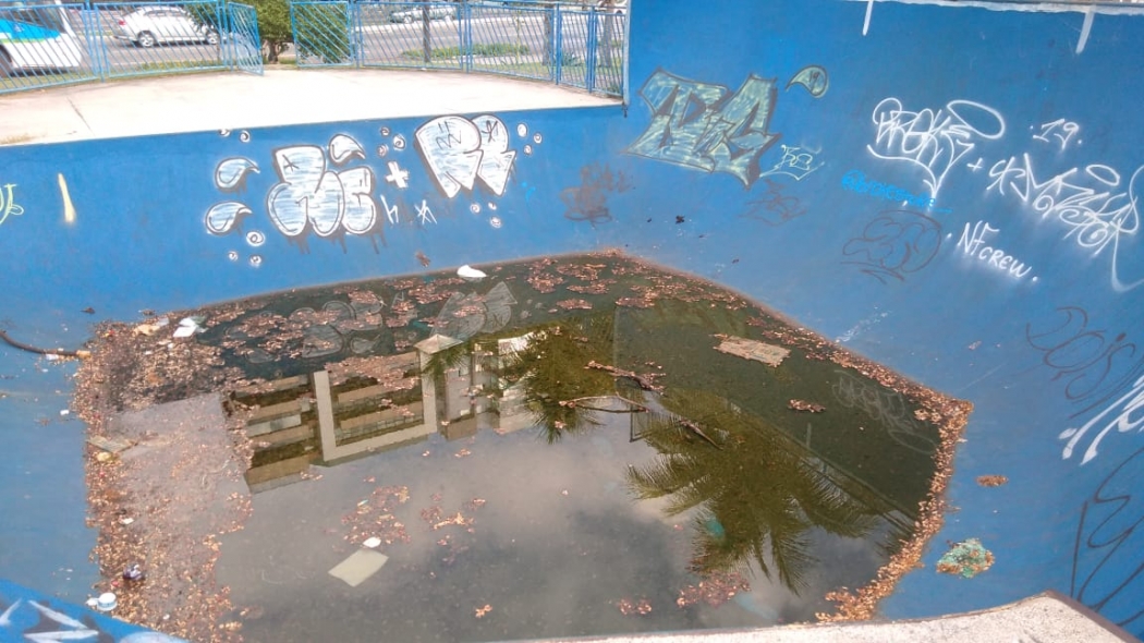 Um deles, uma pista de skate está abandonada com uma poça enorme de água parada, com muito lixo e folhas jogadas no chão. Moradores temem que a área se transforme em foco de mosquitos transmissores de doenças. >