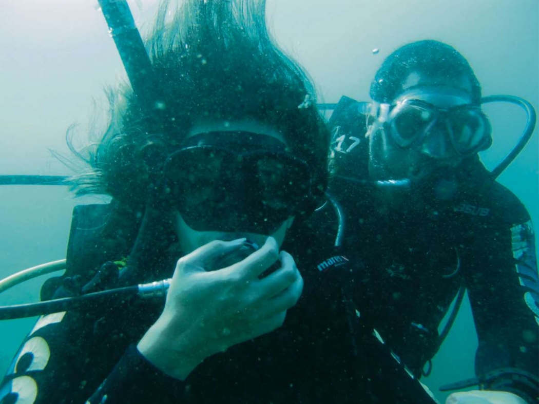 A violoncelista Carolina Luz, 25, já completou cinco mergulhos. Tive medo no início, mas o regulador (aparelho para respiração durante a prática) faz você respirar normalmente, todo mundo tinha que mergulhar pelo menos uma vez na vida.>