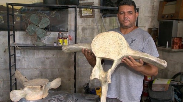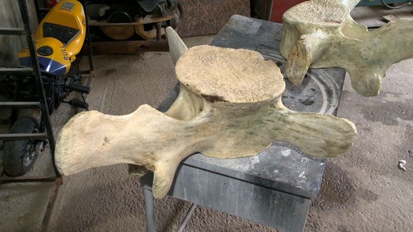 As vértebras foram levadas para a oficina do Andriel. Ele limpou e até passou verniz nos ossos. Nessa chuvinha que deu, lavou a terra que tiraram do valão. Aí, passando, eu vi por cima. Pensei até que era uma madeira. Comecei a cavucar e tinha outro. Peguei os dois e trouxe para casa, disse.>