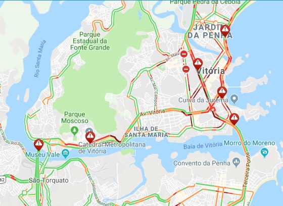 Véspera de feriado e trânsito congestionado. Essa é a situação das principais avenidas da Capital. Já às 17h40, a Central de Trânsito do Gazeta Online registrava intensos pontos de retenção na Jerônimo Monteiro, sentido Cariacica; Maruípe, sentido Serra; Nossa Senhora dos Navegantes, sentido Centro; Dante Michelini, sentido Praia do Canto; Reta da Penha, sentido Centro; e os dois sentidos da Vitória, Cezar Hilal, Desembargador dos Santos Neves, Saturnino de Brito e Américo Buaiz.>