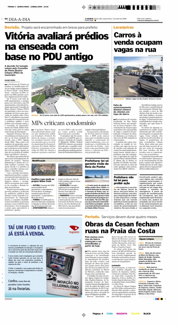 O Conselho Municipal do PDU acatou a orientação, mas a decisão foi questionada pelo Ministério Público, em maio de 2009. Na época, a Justiça também considerou nulo o posicionamento homologado pela prefeitura. O MP defendia que o projeto tinha que ser observado sob a perspectiva do PDU vigente à época da análise, ou seja, o de 2006. O pedido foi confirmado agora pela Justiça Federal, onde a ação tramita desde 2013. São réus no processo a Prefeitura de Vitória e a Nova Cidade Empreendimentos e Participações S/A. Já o Instituto do Patrimônio Histórico e Artístico Nacional (Iphan) é autor da ação junto com o MPF.>