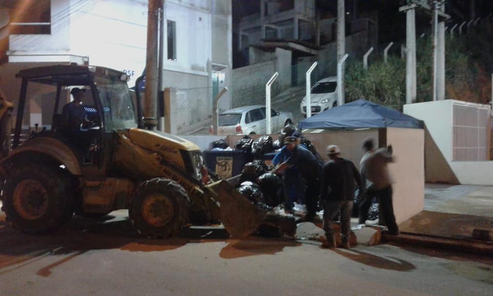 Apenas o veículo menor está circulando, mas não dá conta de atender toda a cidade. Por conta disso, a alternativa foi colocar o caminhão caçamba para armazenar o lixo e a retroescavadeira para recolher a sujeira e colocar em cima do veículo.>