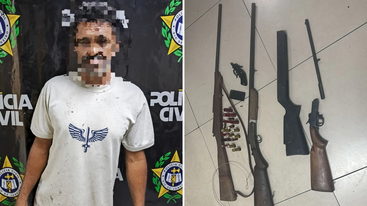 Ainda durante a ação, os policiais apreenderam cinco armas de fogo na residência do investigado, todas sem autorização legal. Diante disso, ele também foi preso em flagrante por posse ilegal de armas. O homem foi encaminhado para a unidade policial no Rio de Janeiro e permanece à disposição da Justiça.>