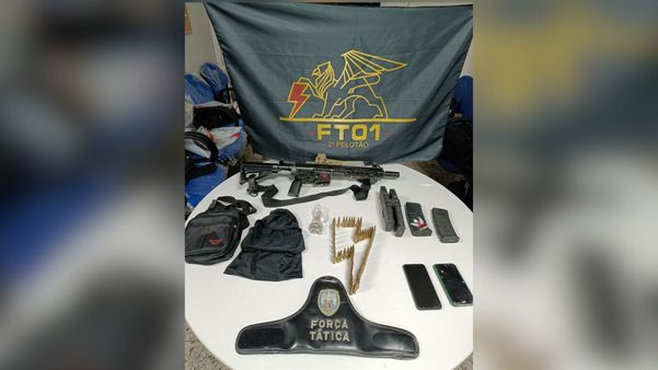 O homem portava uma bandoleira presa a um fuzil calibre 556 com um magnificador e uma mira laser (acessórios estes que potencializam a efetividade do armamento) que estava municiado, alimentado e carregado por dois carregadores acoplados, totalizando 79 munições. Juntamente com o indivíduo também foi apreendida uma bolsa tiracolo contendo dois carregadores de fuzil calibre 556 com capacidade para 30 munições cada e dois celulares.>