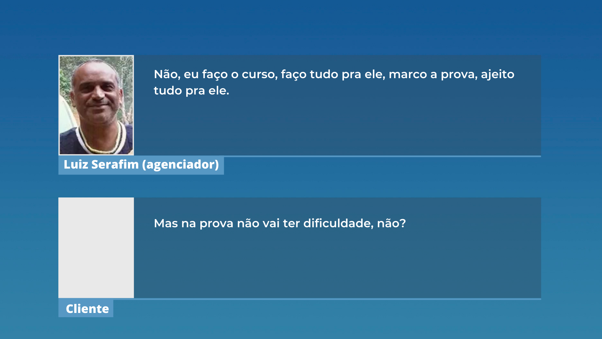 Um dos investigados, Luiz Carlos Borges Serafim, aparece como uma das principais figuras do esquema. Ele é responsável por fazer a intermediação entre os interessados e os postos credenciados. A conversa aparece nas interceptações telefônicas feitas com a autorização da Justiça. Confira abaixo: >