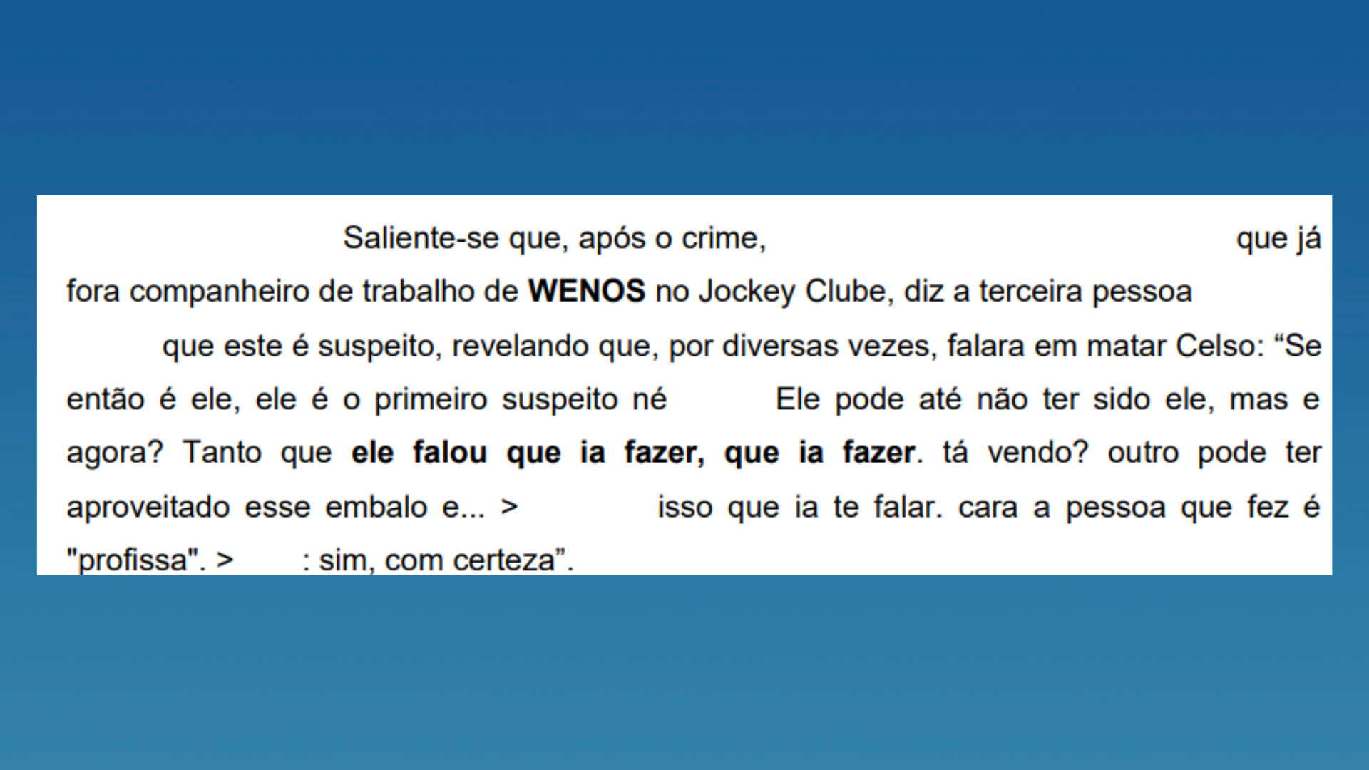 Uma conversa ocorrida após o crime, de um companheiro de trabalho de Wenos, mostra a suspeita em relação à morte do perito aposentado. O homem não teve o nome divulgado na denúncia, mas o documento mostra que o sargento já teria relatado a ele a intenção de matar o perito aposentado.>