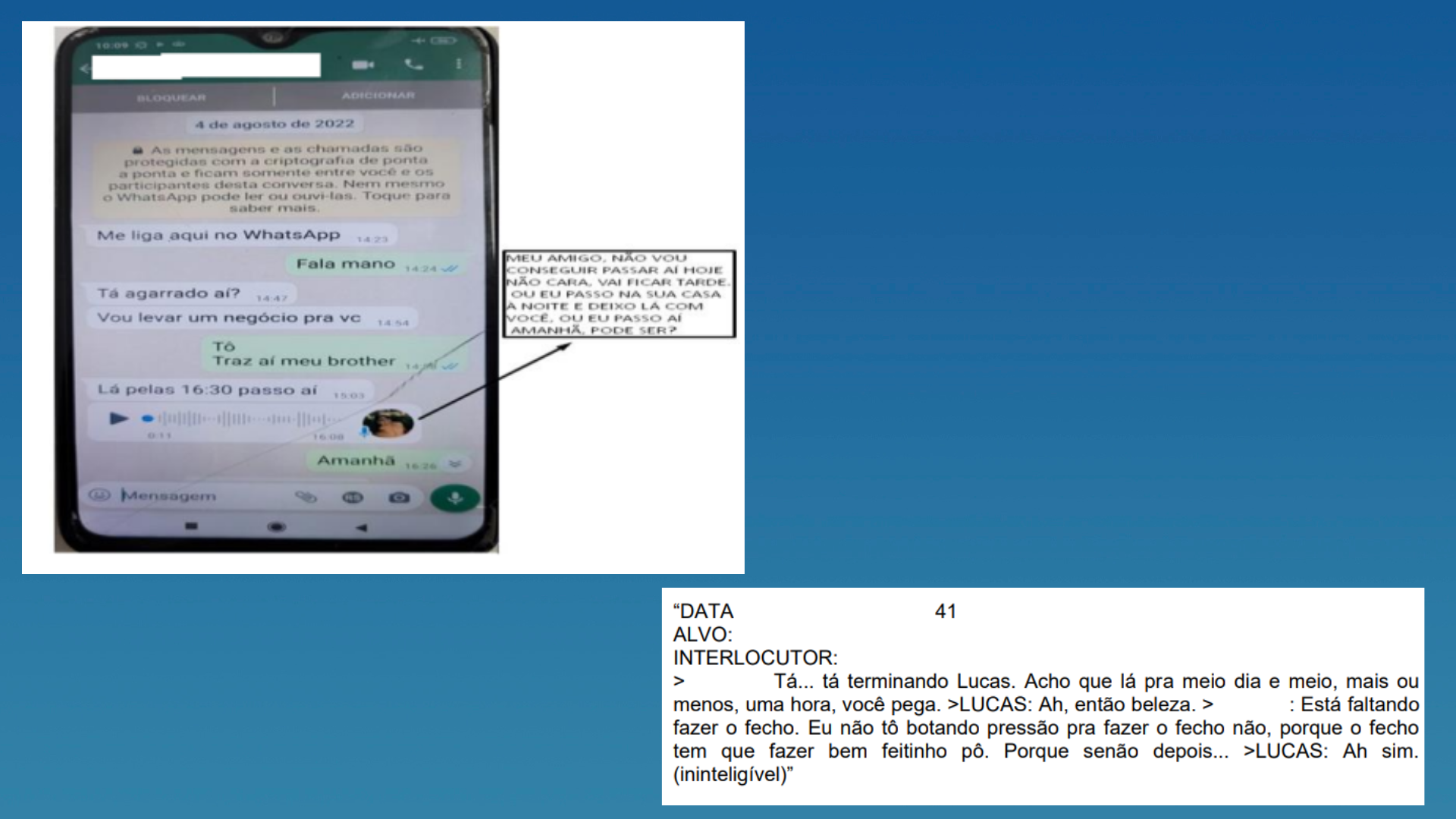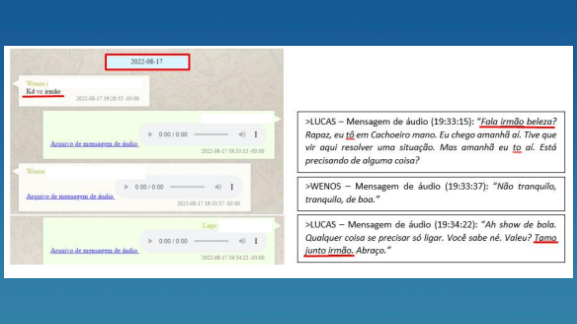 Trechos de mensagens de áudio extraídos de conversas do telefone de Lucas e transcritos durante a investigação evidenciam a proximidade entre os dois militares envolvidos no crime.>