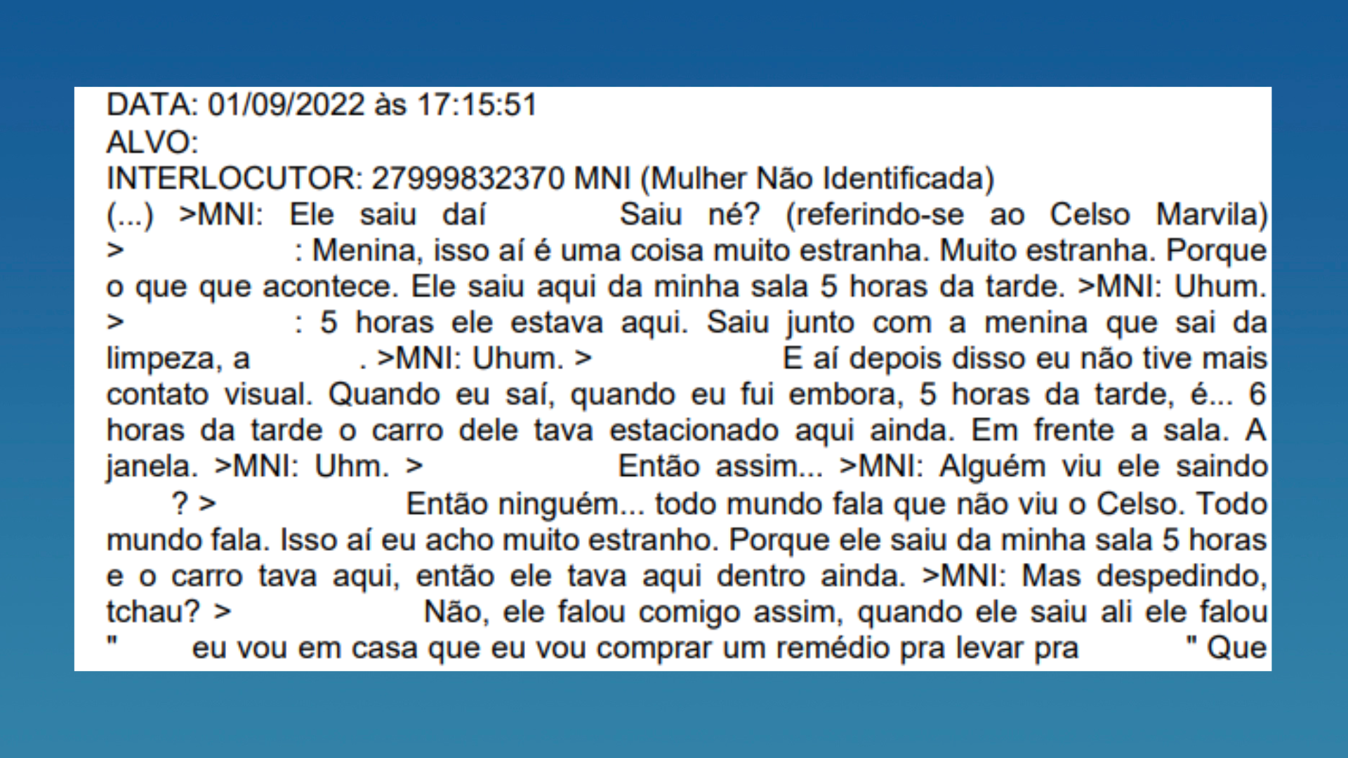 Na transcrição feita pelos investigadores é possível notar que Celso Marvila estava prestes a deixar o Jockey Clube para comprar medicamento para a esposa, quando acabou assassinado.>