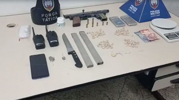 Na residência, os policiais encontraram uma das armas que aparece no vídeo gravado pelos suspeitos, uma submetralhadora caseira, além de dois carregadores alongados, 100 pinos de crack, uma balança e materiais para embalar drogas. Segundo a Polícia Militar, na semana passada, os policiais já tinham encontrado um revólver, que também aparece nas imagens. >