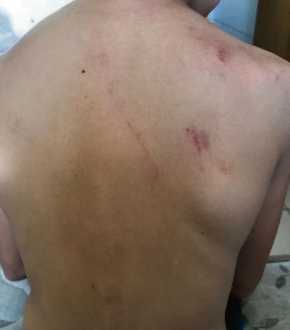 O menino foi rodeado por cerca de 14 alunos e foi alvo de socos. "Quando a garrafa bateu na minha perna, eu levantei a mão e disse que não estava brincando. Mas não adiantou, me empurraram até um muro e deram socos", contou a criança. O estudante contou ainda que chegou a colocar os braços na cabeça, protegendo o rosto e o crânio das agressões. A maioria das pancadas foi nas costas, onde ficaram as marcas dos socos. "Sinto dor nas minhas costas, mas estou triste", disse o menino, cabisbaixo.>
