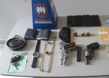 Com os outros dois ocupantes foi apreendido um revólver e uma pistola. Ao todo, com os indivíduos foram apreendidos quatro celulares, duas carteiras com documentos de identidade e cartões, um relógio, dois cordões, dois anéis, um coldre de revólver, um revólver calibre 38 com cinco munições intactas, uma pistola calibre 380 com 13 munições intactas, o carro e vários papéis com placas de veículos. Todos foram encaminhados para a delegacia.>