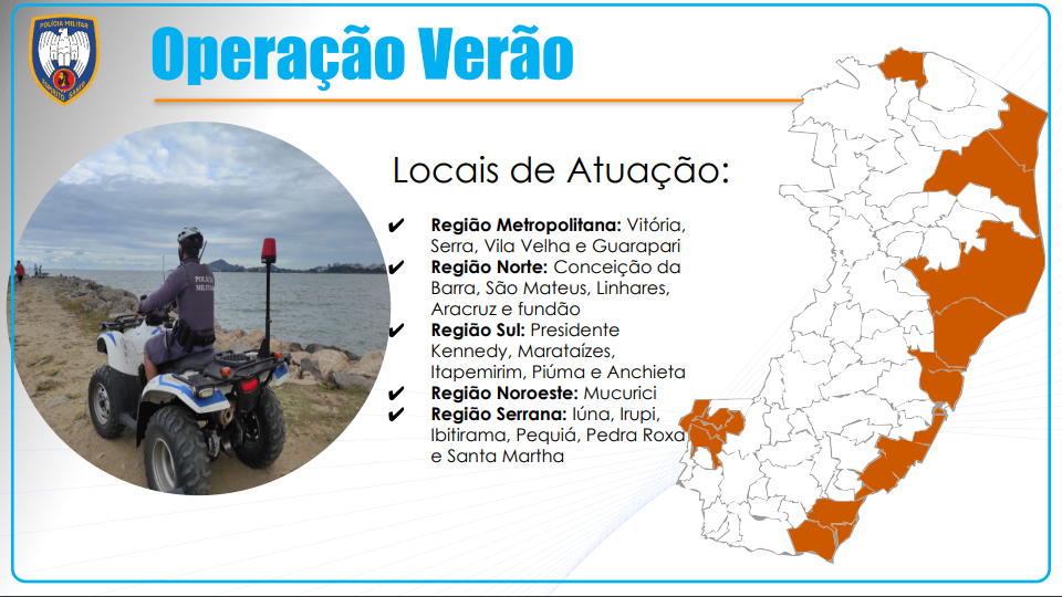 A ação está planejada para ocorrer de 27 de dezembro a 6 de março de 2022. Nos 70 dias de operação, o policiamento ostensivo será reforçado, com o objetivo de proporcionar mais segurança à população que utiliza os balneários capixabas e regiões de montanha.>