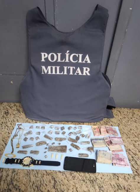 O suspeito foi localizado e, após buscas, a polícia apreendeu dois tabletes de maconha que pesavam quase 2 kg, mais 422 gramas de maconha, 200 gramas de cocaína e 138 gramas de crack, além de duas balanças de precisão, R$ 1.641,00 em dinheiro, um revólver calibre 38 com seis munições, um coldre velado para revólver (acessório construído para transportar armas de porte com segurança), 12 frascos de lança perfume e uma embalagem contendo diversos pinos plásticos vazios.>