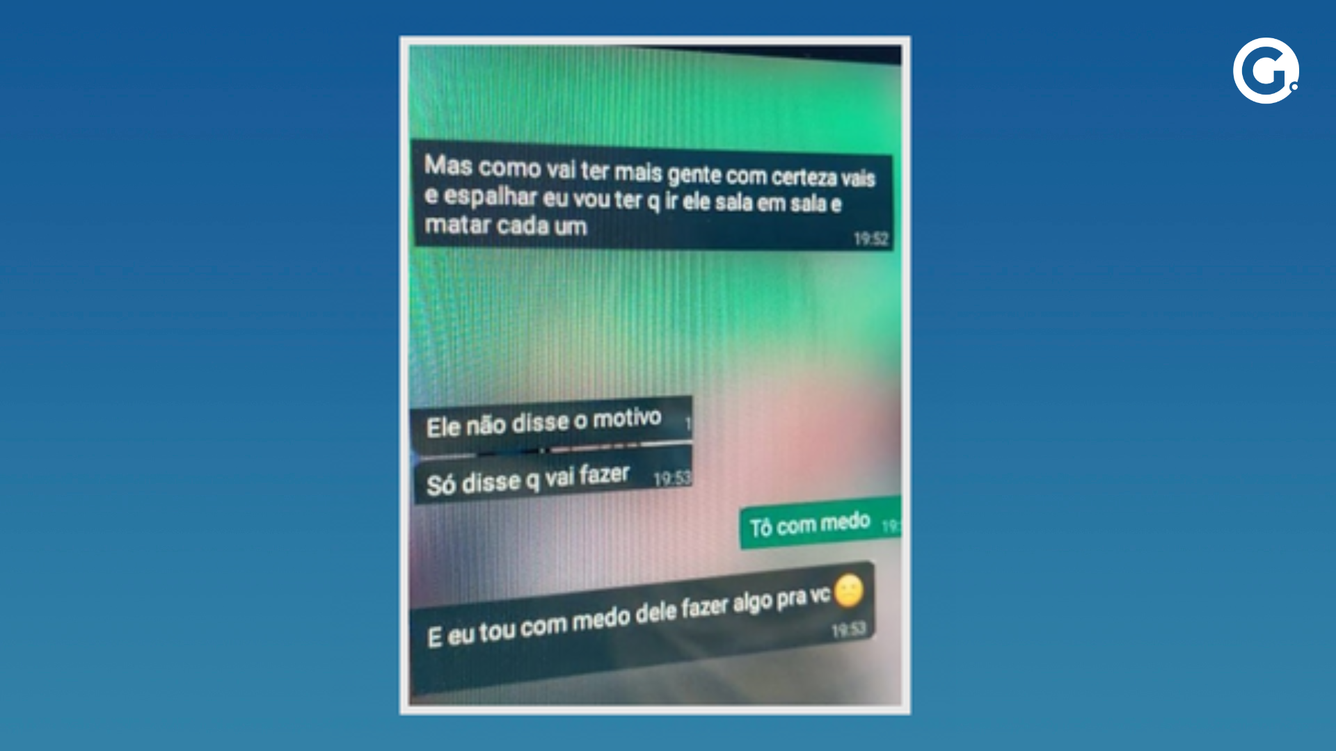 Em outra troca de mensagens, um dos estudantes encaminha o texto escrito por um dos adolescentes: “Mas como vai ter mais gente, com certeza vai espalhar. Eu vou ter que ir de sala em sala, e matar cada um”.>