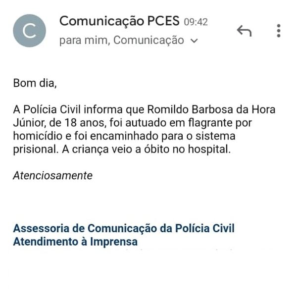 Investigadores do Departamento Especializado de Homicídios e Proteção à Pessoa (DHPP), que foram ao hospital em que a criança está internada, desmentiram a informação dada pela PCES. Os agentes garantiram que o Hospital Infantil de Vitória aponta que o estado de saúde da vítima é "muito grave" e que ela tem "poucas expectativas de sobrevivência", mas que o óbito não foi confirmado. >