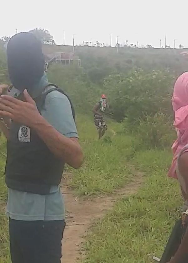 O conteúdo mostra que o suspeito de blusa verde e colete manda recados para os "comparsas". Outro suspeito, o que está gravando chama o grupo de "bonde do Coroa". "O bonde do coroa é a tropa. Forte abraço, família. É nós" finaliza.>