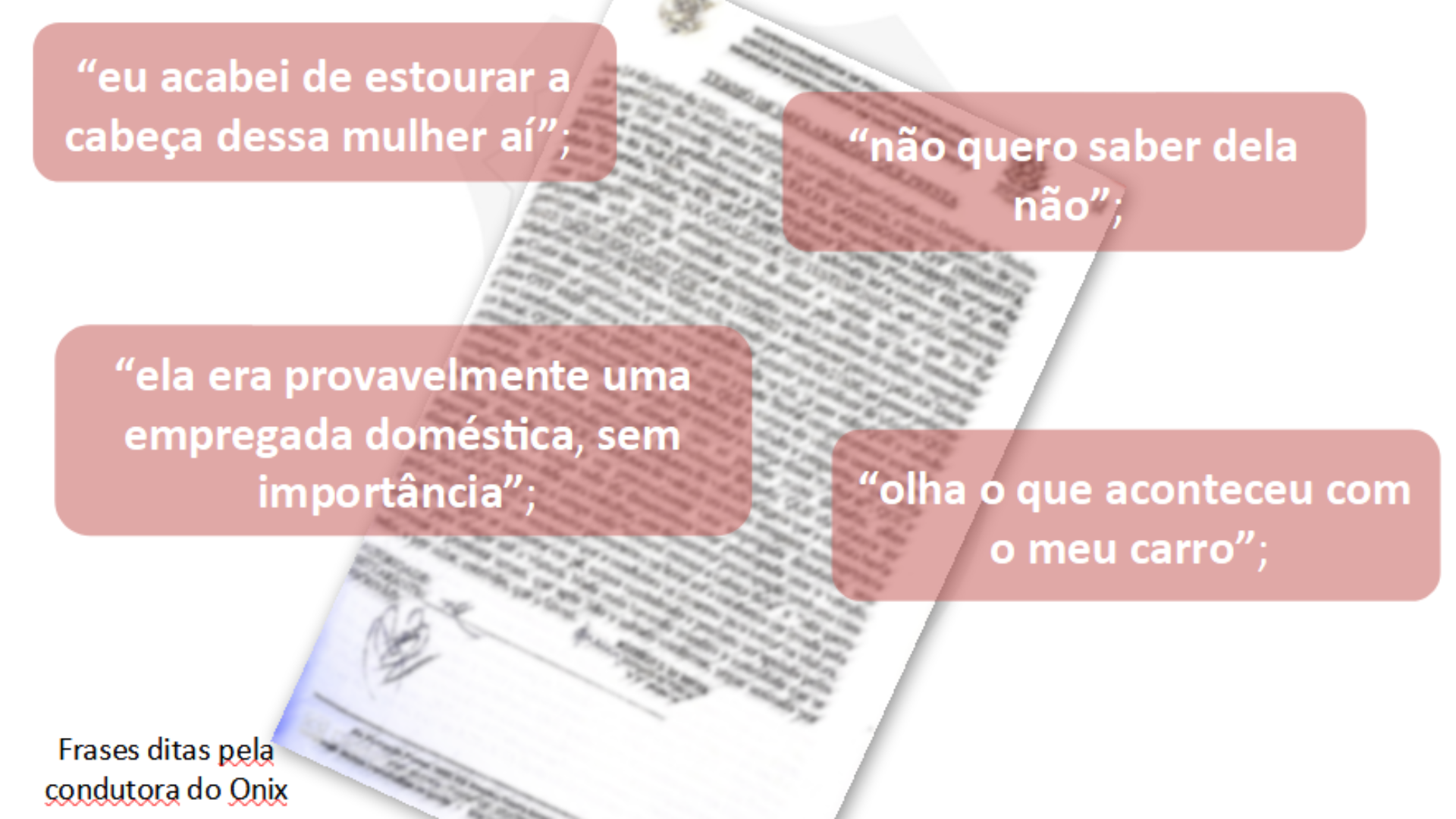 Foram resgatadas frases que a motorista teria dito após o atropelamento: "Eu acabei de estourar a cabeça dessa mulher aí", "Não quero saber dela não", "Ela era provavelmente uma empregada doméstica, sem importância" e "Olha o que aconteceu com o meu carro".>