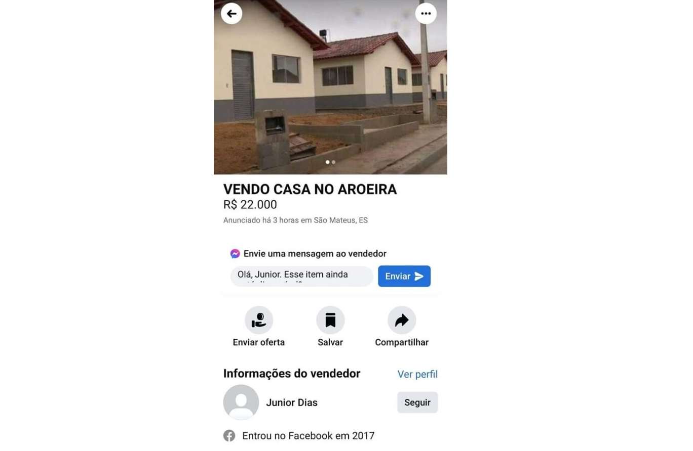 Após uma semana desde a inauguração, a Prefeitura de São Mateus identificou três anúncios, de pessoas diferentes, publicados em redes sociais colocando as casas à venda. Em uma das publicações, é possível ver que uma casa foi divulgada com o valor de R$ 22 mil. Confira abaixo:>
