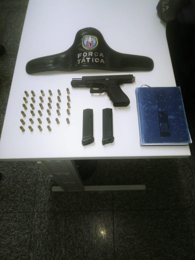 Com o criminoso a polícia aprendeu uma pistola 9 mm, dois carregadores, 34 munições e agenda com anotações do tráfico.>