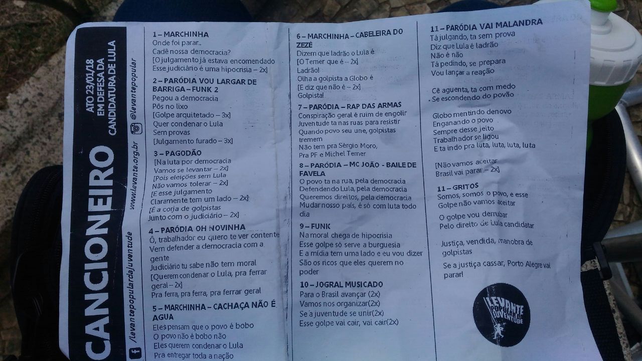 Entre os votos dos desembargadores e as apelações da defesa de Lula e do Ministério Público Federal, chama a atenção na vigília de manifestantes pró-Lula, na Praça Costa Pereira, em Vitória, as paródias feitas por militantes.>