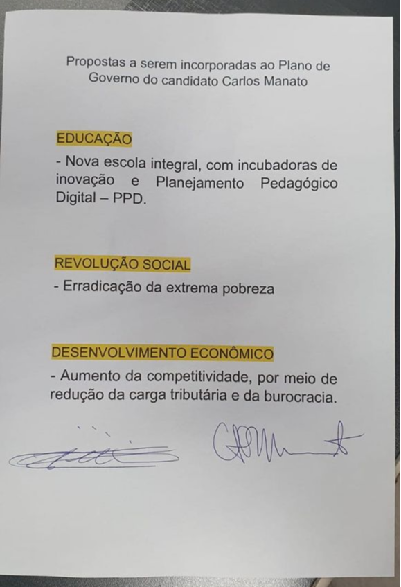 O empresário assinou um termo incorporando as partes mais importantes do seu plano de governo ao plano de Manato.