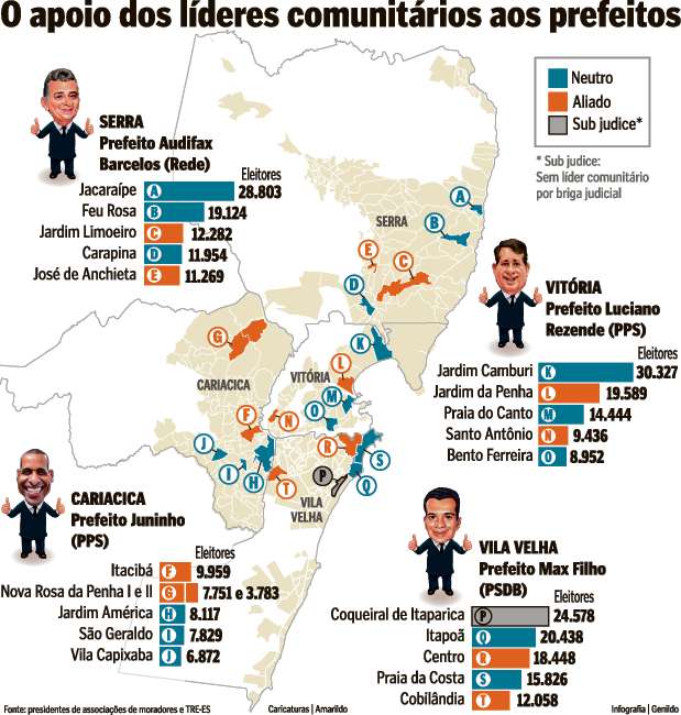 As associações de moradores de Jardim da Penha e Santo Antônio, por exemplo, são presididas por aliados diretos, enquanto que Praia do Canto e Bento Ferreira, apesar de carregarem a bandeira da independência, admitem ter um bom trânsito com a atual gestão.>