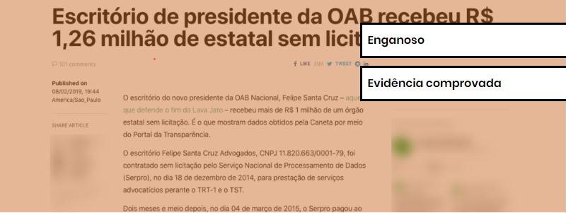 É enganoso um artigo compartilhado nas redes sociais sobre os contratos do escritório do presidente da Ordem dos Advogados do Brasil (OAB), Felipe Santa Cruz, com a Petrobras e o Serviço Federal de Processamento de Dados (Serpro) durante a gestão da ex-presidente Dilma Rousseff (PT).>