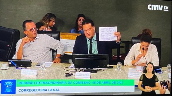 A folha com os escritos mencionados foi exibida por Monjardim, depois que o vereador Anderson Goggi disse que estava apresentado o documento à Corregedoria para avaliação. Nesse momento, houve confusão. Várias pessoas falando ao mesmo tempo, indignação por parte de alguns membros da Corregedoria e um questionamento ao empresário feito pelo vereador Luiz Emanuel: "O senhor assinou a representação: sim ou não?" >