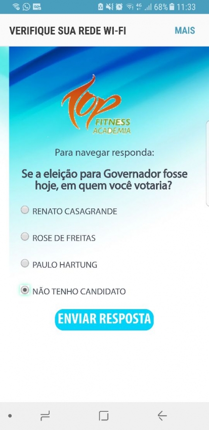 Uma empresa que oferece serviço de internet Wi-Fi gratuita para empresas e espaços compartilhados na Grande Vitória exigiu dos usuários, para autenticação da conexão, uma resposta a pergunta sobre a disputa pelo governo do Estado.>