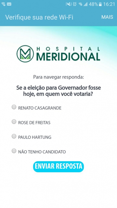 Mas o tema político não havia sido autorizado por empresas que usam a plataforma de conexão da empresa de internet, a Sempre On, e exigiram a remoção da pergunta. Aconteceu em pelo menos dois lugares. Na academia Top Fitness, em Jardim da Penha, Vitória, e no Hospital Meridional, em Alto Lage, Cariacica. >