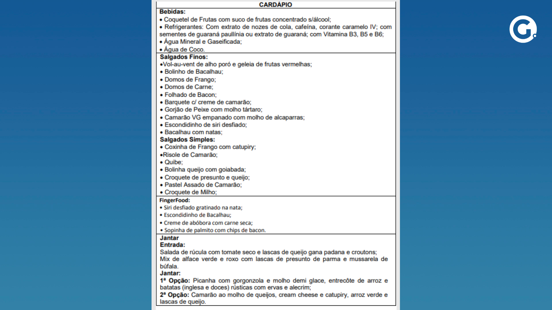 A planilha ainda mostra um cardápio com a descrição das bebidas e comidas a serem oferecidas no evento. Entre os pratos estão camarão de variação grande (VG), bacalhau em natas, casquinha de siri e picanha com gorgonzola. Confira o cardápio:>